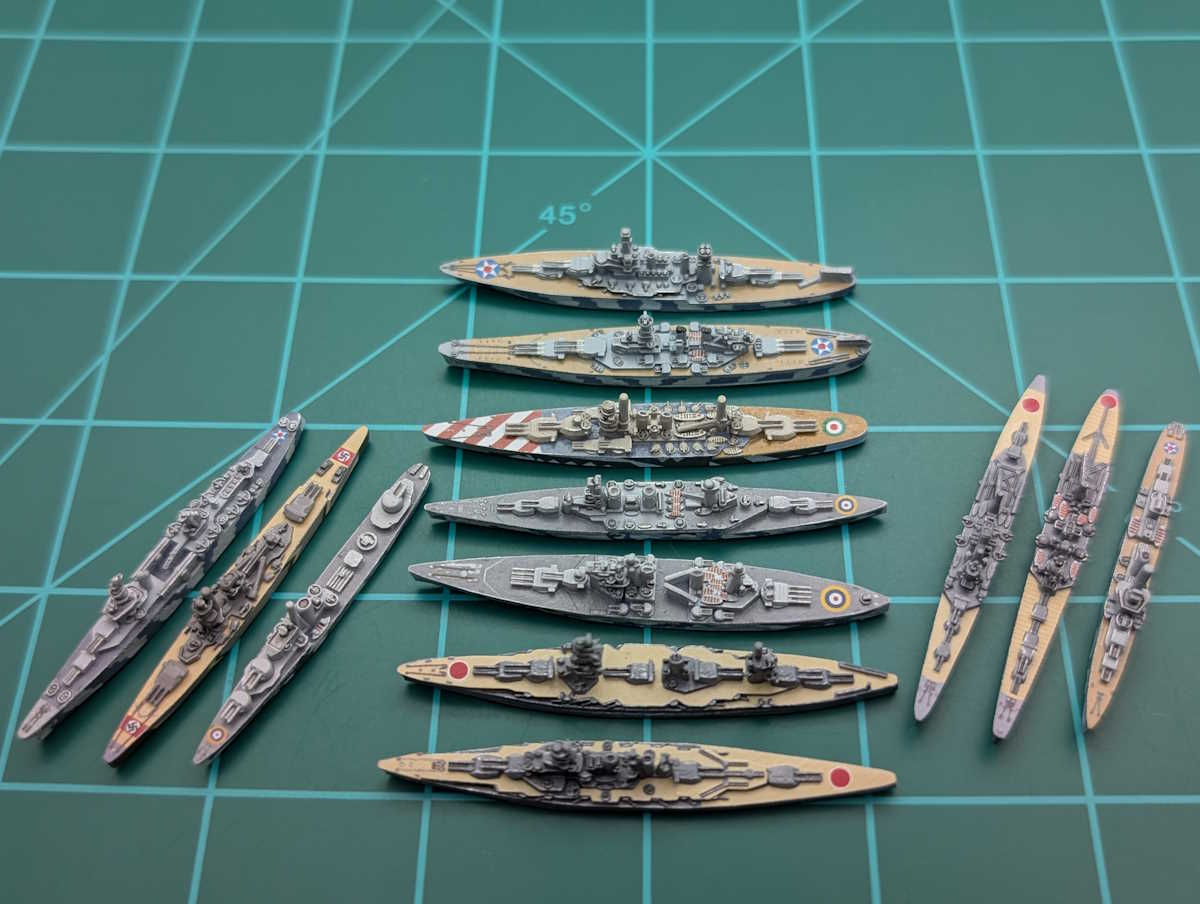 Below are the big boys: Yamato class 1944, King George V class with hull camouflage and the Bismarck class with hull camouflage.