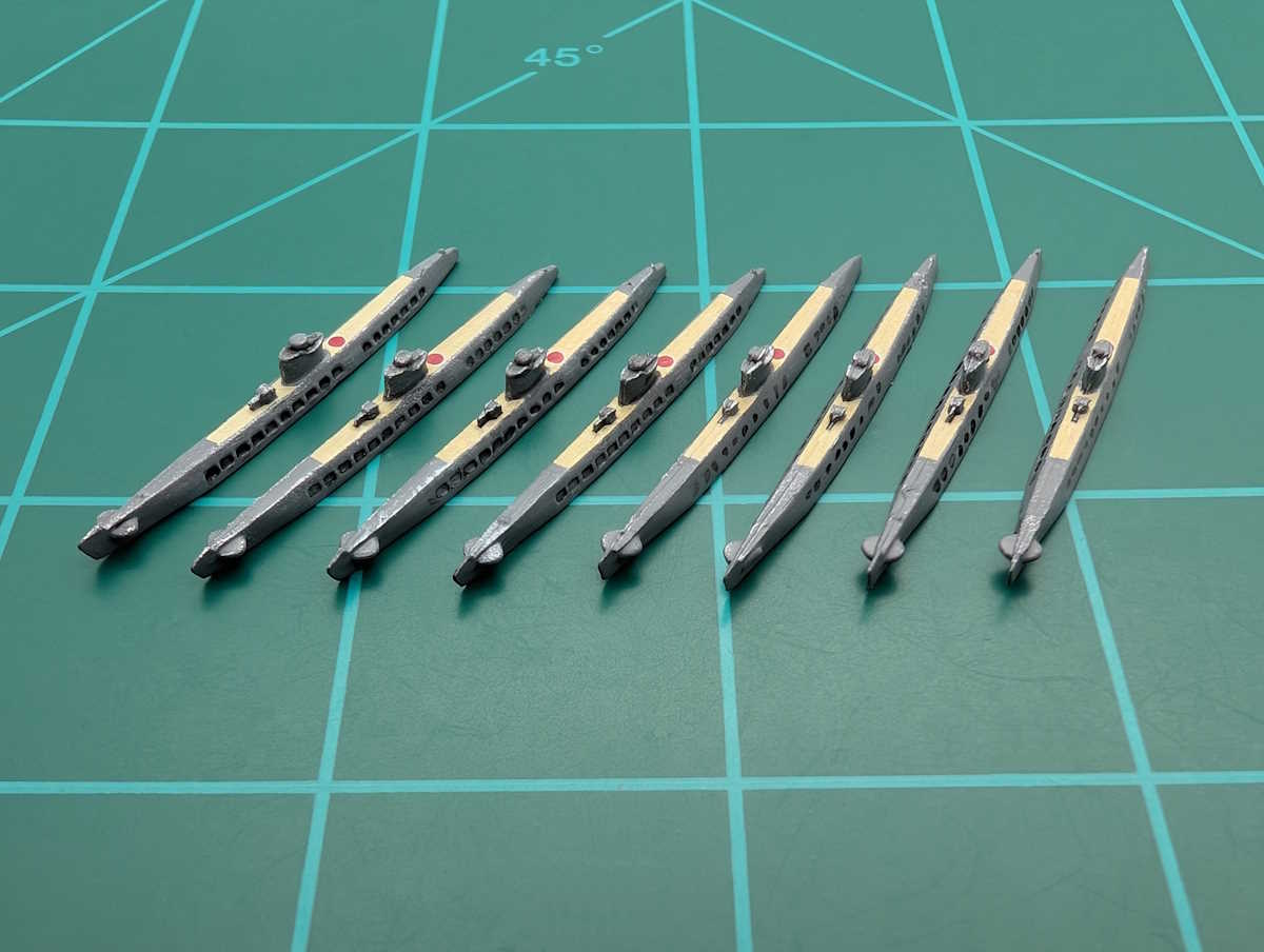 This order is a typical mix of German surface ships and submarines with national flag insignia. The carrier is the HBG injection molded game piece that I magnetized to hold 2 planes. These are essentially unbreakable but not as detailed as the 3d printed carriers.