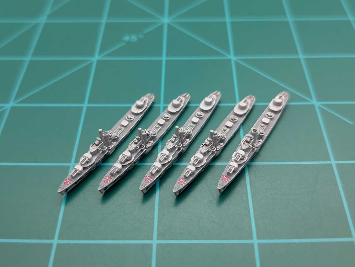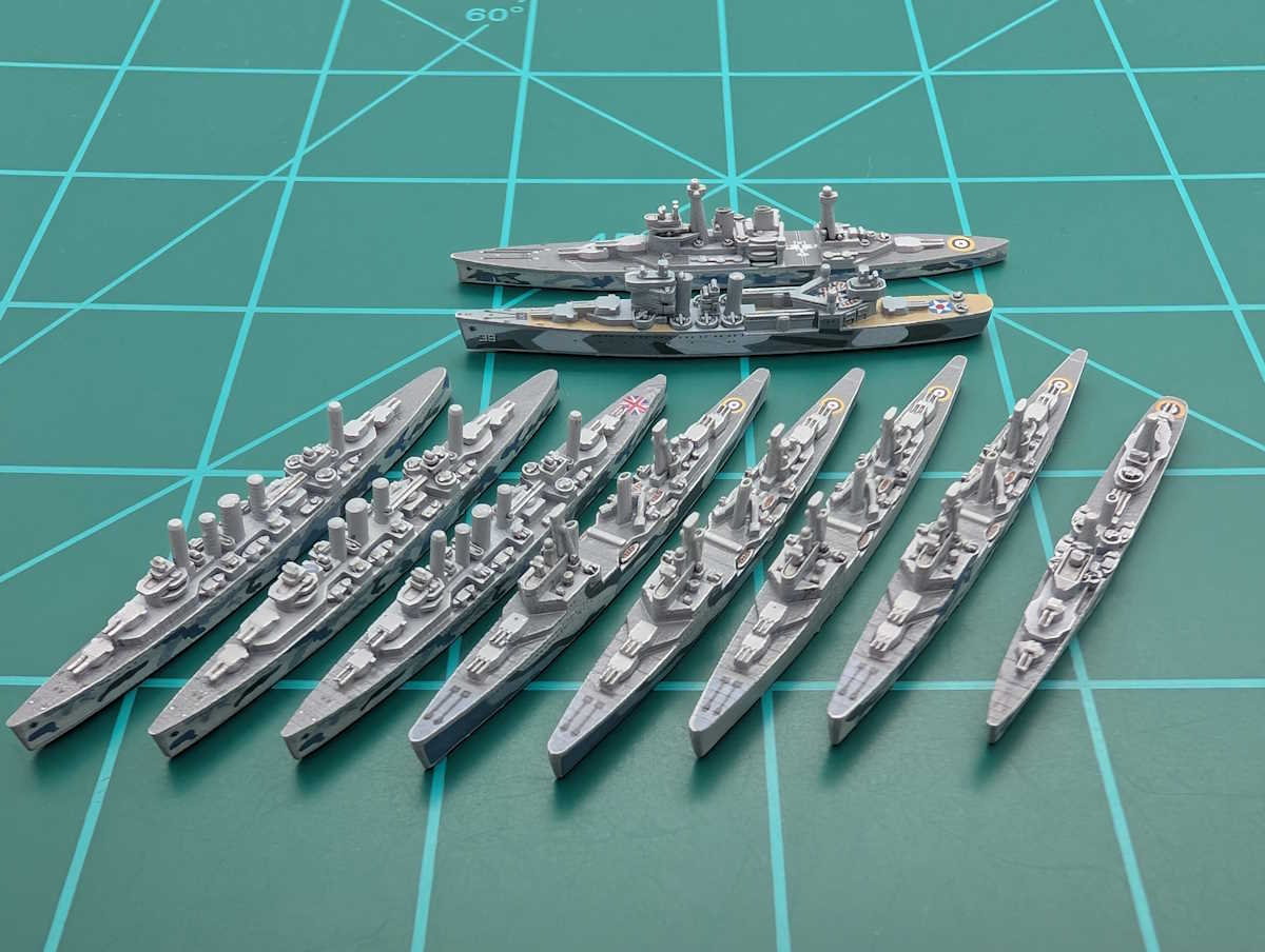 This is a small group of UK cruisers outfitted with early war and late war hull camouflage.